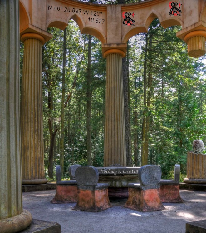 Limestone stairs encircle the pillars, allowing approach to the center from all sides though, the archway that faces the long-since tangled path gives the impression of a doorway. It would take some real bushwhacking to approach the enclosure from any other direction where the woods merely stretch onward into thick pacific-northwest forestry.