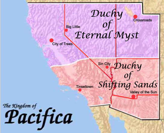 The Kingdom of Pacific covers the southern half of the west coast of New World Faery (or, the North America). It is divided into two Duchies: Eternal Myst (in the North) and Shifting Sands (in the South). During the frontier days, the Wild Fae vied for lands practically radiating with gold, silver and other shiny metals that are particularly cherished by Leprechauns, Tommynockers, Dwarves, Pixies and the like.