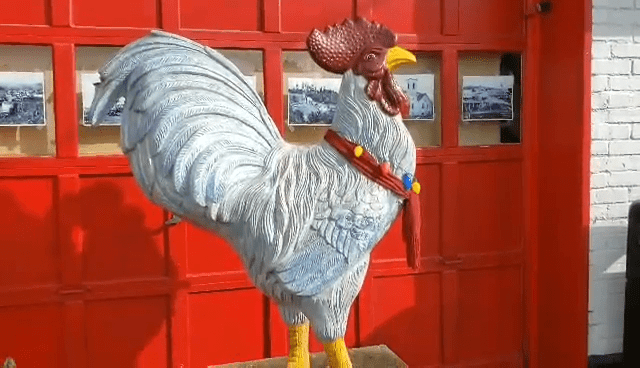 Following the gaze of the Historical White Rooster, a red and gold feathered friend can be seen.
