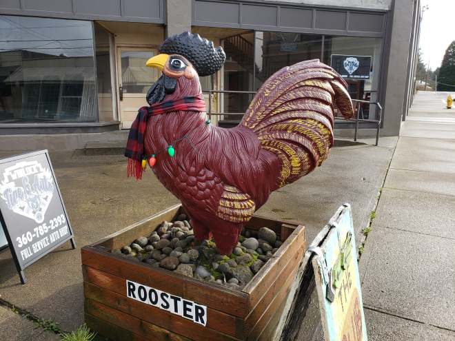 Perched in a planter right on that corner of 1st and Walnut, this big guy is a happy greeter to those coming into town and from his corner can be seen both the historical rooster and a poncy pink and purple rooster sporting a scarf, down the hill and across the previously seen railroad tracks.
