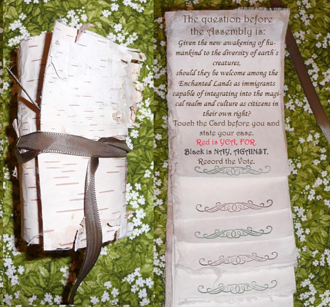 No sooner is a seat around the stone table occupied than the vista-scape shimmers, the sounds of nature falling mute. The scrollcase, previously transluscent is now perfectly tactile. The lid secured by a silver-fabric frog, easy to unhook and twist off.